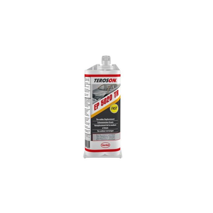TEROSON® EP 5020 TR is a 2-part epoxy adhesive with Part A in dark grey and Part B in white or light grey. It is specifically designed for fast rebuilding of metal surfaces, such as steel or aluminium car bodies or vehicle shells. Typically used as a lead-free alternative to tin solder, it fills and smooths out damage. This adhesive is perfect for final modelling of pulled dents in hard-to-reach areas or welded joints. It contains no isocyanates, silicones or lead, and does not shrink or sag. It is excellent for grinding and has good reshaping properties. Its easy application saves time, as it eliminates the need to remove airbags, plastic components, fabrics, and the fuel tank or inlet.